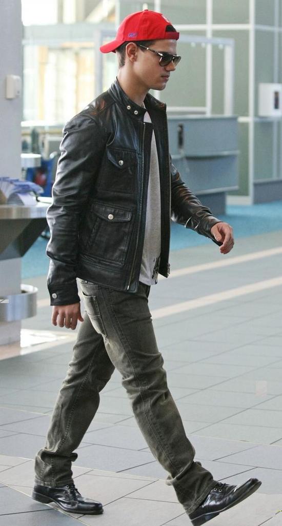 “The Twilight Saga: Eclipse” star Taylor Lautner leaves Vancouver International Airport (YVR) looking cool in a leather jacket, backwards hat, and sunglasses.